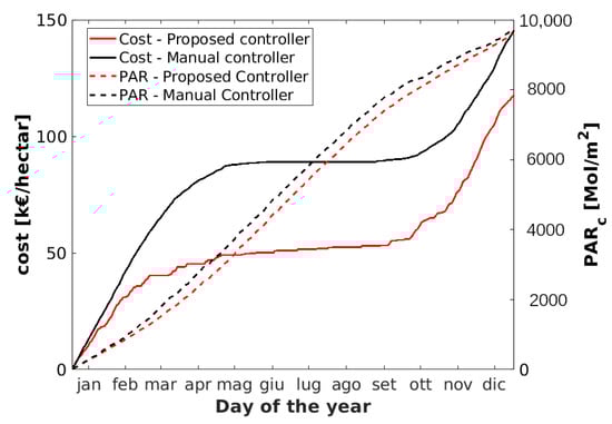 is the coefficient of the controller indirect open-loop feedback. It reduces the required daily period of artificial lighting as a function of the natural outside the greenhouse cover. Several thresholds of are arbitrary fixed, and, once reached, the artificial lighting period is reduced by a fixed time-span [50]. For example, the coefficient can be set to satisfy the rule “If the outdoor natural light reaches 12 moles per day, reduce the daily hour of artificial lighting system of 1 h”. These thresholds can be defined by the farmer through the greenhouse computer.