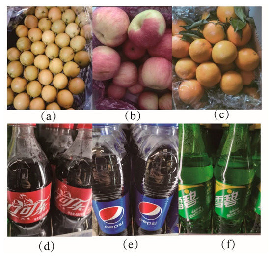 The sweet drink materials tested in this work. (a) pears; (b) apple; (c) oranges; (d) Coca-Cola; (e) Pepsi; (f) Sprite.