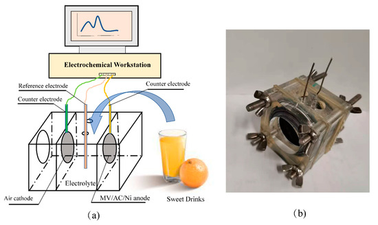 The single-chamber AFC (Figure 2) was fabricated of polymethyl methacrylate (PMMA). It consisted of a methyl viologen/activated carbon/Ni (MV/AC/Ni) anode [16], a Cu2O-Cu composite air-cathode and a cylindrical internal chamber (14 mL).