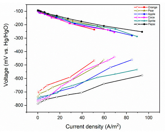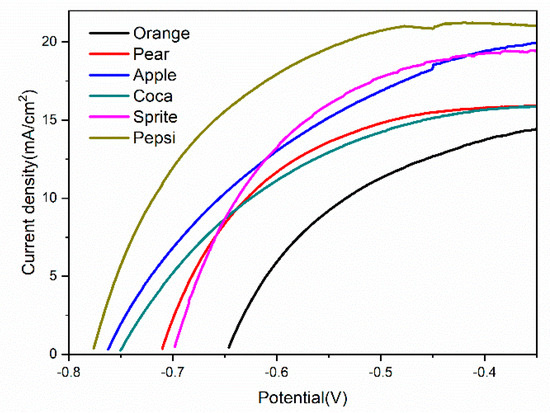 Among three carbonated drinks, Pepsi had the highest current density comparing with others. At the potential of –0.35 V, the current density of Pepsi reached 21.03 A/cm2, followed by Sprite (19.43 A/cm2) and Coca Cola (15.90 A/cm2). Comparing the current density between juice and carbonated drinks, it’s obvious that carbonated drinks always had better performance. What’s more, the current density of Pepsi was higher than that of apple juice, and orange juice was still the lowest. According to a survey of 903 beverage samples, Deng et al. [21] drew the conclusion that carbonated drinks had a high sugar content, reached up to 13.6 g/100 mL and 60%. Hashem et al. [22] assessed the free sugars in carbonated sugar-sweetened beverages and highlighted the performance of Coca Cola with an average sugar content of 35 g/330 mL. Therefore, high content of sugar in carbonated drinks is one reason for their super performance.