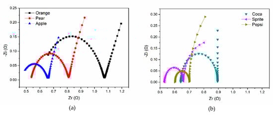 EIS Nyquist plots of the AFC anode with different sweet drinks as substrate (a) juice drinks: orange, pear and apple; (b) carbonate beverages: Coca, Sprite and Pepsi.