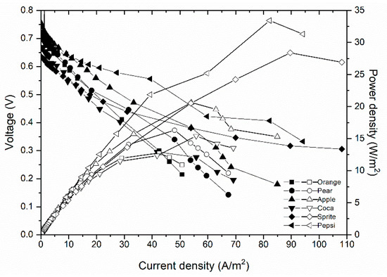 A series of power density measurements were performed in the AFC filled with different substrates. Figure 5 shows the polarization curves and power density plots of the same fuel cell fueled with different sweet drinks under the condition of 3 M KOH. The fuel cell performed excellently for all the six sweet drinks. The maximum power density of 33.41 W/m2 and 28.38 W/m2 were obtained when Pepsi and Sprite were filled, which is almost 1.6 and 1.4 times higher than the AFC filled with apple juice (20.63 W/m2), respectively. The next were those of Coca Cola and pear juice, which obtained the maximum power density of 16.31 W/m2 and 15.31 W/m2, the maximum current density of 67.37 W/m2 and 69.14 W/m2, and OCV of 0.72 V and 0.67 V, respectively. And the orange juice AFC produced the worst performance among all the AFC, which had the maximum power density of 12.75 W/m2. The power densities of the fuel cell filled with six sweet drinks were much higher than that of our previous test with pure glucose as substrate (9.590 W/m2) [28], implying that there were some other reducing substances, besides sugars, existed in the soft drinks. These reducing substances could also be oxidized and released electrons in the AFC [29].