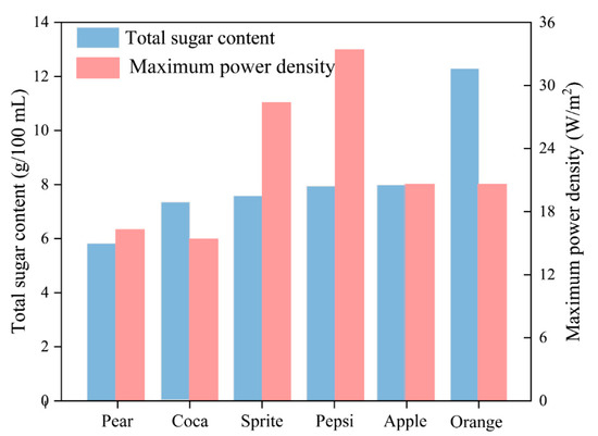 Power densities of the AFC fueled with different sweet drinks and their total sugar contents.