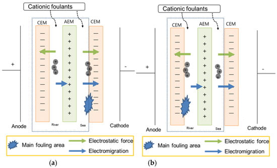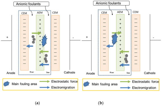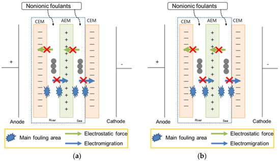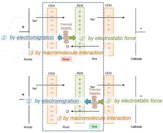 | Adsorption by electrostatic attraction | strong AEM fouling /weak AEM fouling | strong CEM fouling /weak CEM fouling | none/none |