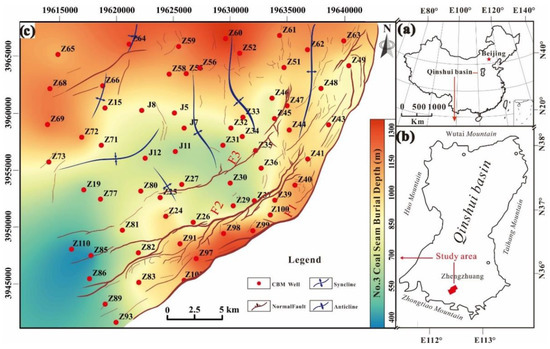 Qinshui basin located in the south-central region of North China is a Mesozoic basin evolved from the late Paleozoic, and it is a large north-to-east symmetrical syncline basin [7,36]. This basin is surrounded by the Wutai Mountains to the north, the Zhongtiao Mountains to the south, the Huo Mountains to the west, and the Taihang Mountains to the east [8]. Zhengzhuang field covering an area of 834.4 km2 is located in the south of Qinshui Basin. Since the occurrence of coal accumulation in the Carboniferous Permian, the Zhengzhuang CBM field has experienced the Indosinian orogenesis (late Permian-Triassic), Yanshan orogenesis (Jurassic-Early Cretaceous), early Himalayan orogenesis (Late Eocene) and late Himalayan orogenesis (Late Tertiary) successively [37]. During the Indosinian, the Zhengzhuang field was uplifted slightly due to the weak compressive tectonic stress along the N-S direction [38]. The basic shape of the northeastern syncline was formed under the NW-SE compressive stress because of the strong tectonic movement in Yanshan orogenesis. There was magmatic activity developed in the northern and southern regions of the basin, which further increased the degree of coal metamorphism [10]. In the early Himalayan period, the NW-SE principal compressive stress transformed to the NWW-SEE extensional stress [39]. When it came to the late Himalayan period, the regional principal compressive stress was transformed to the NNE-SSW, after which the strata experienced uplift and erosion [40].