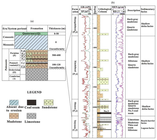 The North China Craton Basin was eroded from the Silurian to Mississippian time, with the subsiding basin receiving sediment from Pennsylvanian to Triassic [7]. The basin developed Pennsylvanian Benxi Formation (C2b), Taiyuan Formation (C3t), Permian Shanxi Formation (P1), Xiashihezi Formation (P1x), Shangshihezi Formation (P2s), Shiqianfeng Formation (P2sh), and Triassic-Quaternary deposits [41]. The Taiyuan and Shanxi Formations are the main coal-bearing strata, with an average thickness of 150 m. The main CBM reservoirs are the No. 3 coal seam of Shanxi Formation and the No. 15 coal seam of Taiyuan Formation, which have good lateral continuity with total thicknesses of 7–16 m [36].