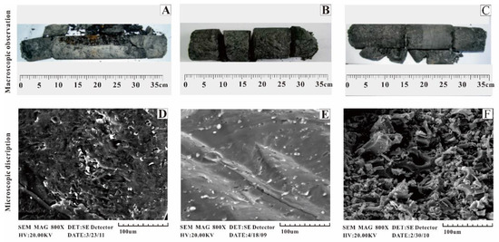 Typical characteristics of coals with different macrolithotypes ((A,D) bright coal; (B,E) semi-bright coal; (C,F) semi-dull coal)).