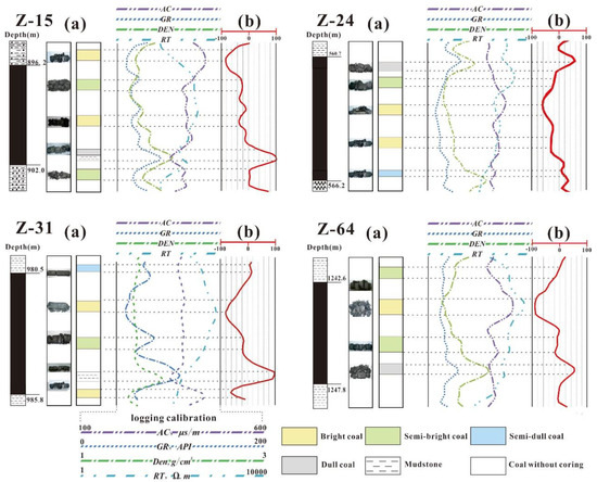 Coal macrolithotypes with different physical properties and compositions show different responses to logging data [16]. The well logging types used in the study area, mainly include DEN, AC, RT, GR, CNL (compensated neutron log), SP (spontaneous potential) and CAL (caliper log). For characterization of coal lithotypes, we did not consider the CNL, CAL, and SP, because (1) the CNL can be different in coal seam with different gas content, (2) the SP may change with different water content in the coal seam, and (3) the results of the CAL is easily affected because of borehole collapse [21]. Thus, we chose the AC, DEN, GR, and RT to classify coal lithotypes. In general, bright lithotype-rich coals (bright coal and semi-bright coal) have low DEN and high AC and RT because of the well development of pores and fractures, and commonly high gas content in bright coals) [45]. In contrast dull lithotype-rich coals (semi-dull coal and dull coal) have high ash yields, which results in a high value of GR [46].
