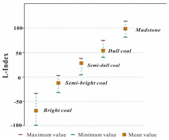 Figure 5 shows the L-Index values which are calculated from the 19 core samples with the range from −97.12 to 122.14. The L-Index values of different coal macrolithotypes and mudstone interlayer show a negative correlation with the L-Index. Thus, the coal macrolithotypes were divided into bright coal with the L-Index (L) ≤ −32, the semi-bright coal (−32 < L ≤ 5), the semi-dull coal (5 < L ≤ 38), and the dull coal (38 < L ≤ 82). The L > 82 indicates mudstone interlayer.
