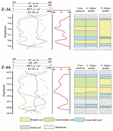 Comparison of results of coal macrolithotype identifications based on core analysis and the well logging interpretations for Well Z36 and Well Z66. The logging interpretations based on both the L-index model in this study and N-index model from Tao et al., 2019 [16], are presented.