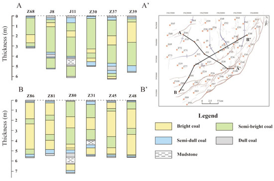 Based on the L-Index method mentioned in Section 3.3, the vertical distributions of macrolithotypes in No.3 coal seam were investigated. Two typical cross-sections of the A-A’ and B-B’ sections are presented in Figure 7.