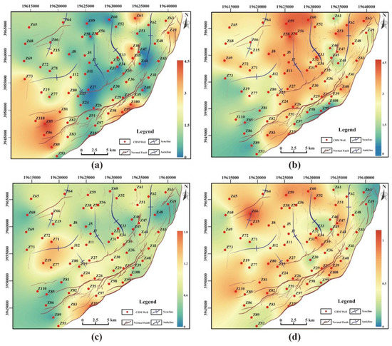 The regional distributions of coal macrolithotypes in the Zhengzhuang field are shown in Figs. 8. In general, the Zhengzhuang field is dominated by bright and semi-bright coals with thicknesses ranging from 2 to 5.6 m with an average of 4.2 m. The thickness of bright coal ranges from 0.3 m to 4.1 m with an average value of 1.6 m. Bright coal with a thickness of ≥3.2 m is distributed in the southwest, southeast, and northeast of the study area (Figure 8a). In contrast, bright coal with thickness of <0.5 m is in the northwest, central and north areas. As for semi-bright coal, it ranges from 0.8 m to 4.3 m with an average of 2.7 m (Figure 8b). It is mainly distributed in the central part and the northeastern area with a thickness exceeding 2.8 m, but it has a thickness no more than 1.3 m in the southwestern and southeastern area. The thickness of semi-dull coal ranges from 0.3 m to 1.8 m with an average of 0.7 m (Figure 8c). The semi-dull coal is mainly distributed in the central and southeastern regions. In the case of dull coal, it is widely distributed in the northern and southern regions with a thickness range of 0.1–1.1 m (Figure 8d).