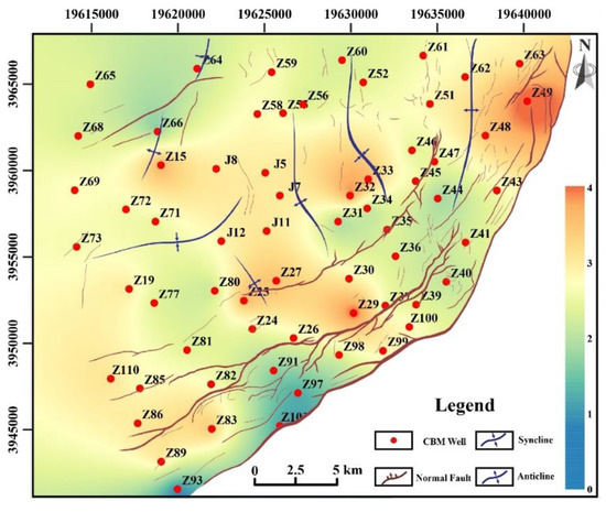 The S-Index is defined as a value from 1 to 3.7: smaller S-Index indicating higher degree of brightness. According to Equation (11), we calculated S-Index isovalue map in the Zhengzhuang field. For example, the S-Index of the well Z15 is 1.90, and the coal macrolithotypes of the well are dominated by bright and semi-bright coal. In contrast, for the well Z47 whose S-Index equals to 2.84, the proportion of semi-dull coal and dull coal is as high as 38%.