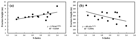 Relationship between S-Index and fracturing efficiency. (a) Relationship between S-Index and fracture height. (b) Relationship between S-Index and fracture length.