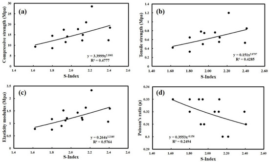Relationship between S-Index and coal rock mechanics parameters. (a) Relationship between S-Index and compressive strength. (b) Relationship between S-Index and tensile strength. (c) Relationship between S-Index and elasticity modulus. (d) Relationship between S-Index and Poisson’s ratio.
