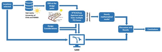 This section describes the methodology followed for the study described in this paper. Figure 2 shows the modeling process, which begins with the selection of a place where the solar resources from a typical meteorological year (TMY) are evaluated, from which, after an analysis of the solar resource, it is possible to obtain the day and design point for the modeling of PTSTPPs. Together with previous design considerations, hourly, monthly, and annual results are obtained. These results are compared with an independent simulation using the software system advisor model (SAM) software developed by the National Renewable Energy Laboratory (NREL), using the same parameters, such as the numbers of solar collector assemblies per loop (N SCA/loop), aperture area, solar multiple (SM), and TES capacity detached from the independent simplified model, and using the same design conditions. Subsequently, the discussions and conclusions are presented.