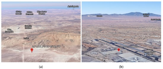 The selected locations are shown with a satellite view in Figure 3. One of the main differences between these locations is found in the DNI indexes, which have a direct impact on the electrical energy production of PTSTPPs, as clearly evidenced in the equations presented in Section 6 and in the modeling results shown in Section 7. The site located in the Atacama Desert (see Figure 3a) has a high solar energy potential that registers an annual average of daily global horizontal irradiation (GHI) that exceeds 7.5 kWh/m and 9 kWh/m in the case of DNI, and it is also characterized by large areas of flat land [,,,]. The location selected in the state of Arizona (see Figure 3b), USA has an annual average of daily GHI and DNI that reach 5.8 kWh/m and 7.4 kWh/m, respectively.