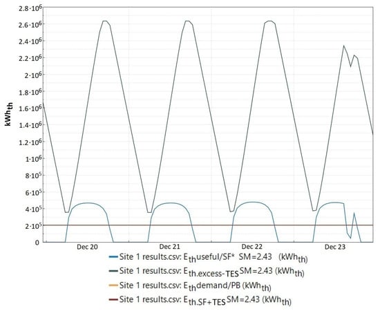 In which corresponds to the thermal energy deficit in for the hour “n”, between the thermal energy demanded by PB for a full load operation and the SF’s useful thermal energy, and corresponds to the efficiency of the TES/HTF heat exchanger system of the PTSTPP modeled. Thus, the combined operation of the SF plus the TES in for hour “n” can be computed through the following expression: