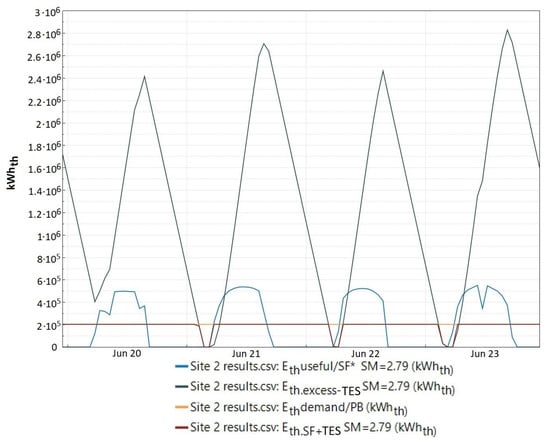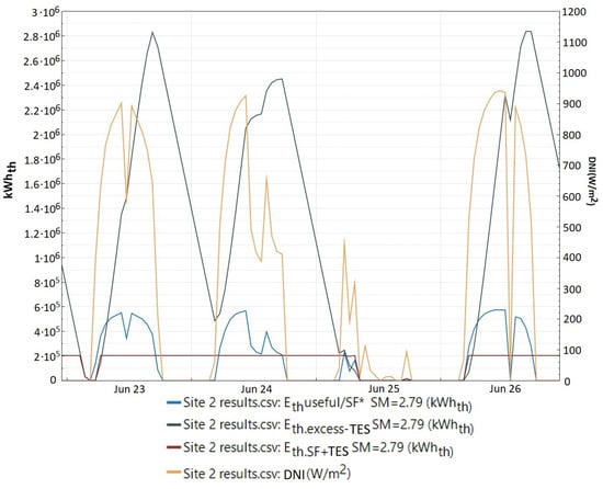 The main results that represent the thermal performance of the PTSTPPs under study are shown in this section. These results are obtained through Equations (12), (14), (15), (18), and (19). Hence, the behavior of the useful thermal energy of SF (blue curve), thermal energy jointly delivered by the SF and the TES (brown curve), surplus thermal energy stored in the TES (black curve), and the thermal energy demanded by the PB are shown in Figure 4 and Figure 5 for sites 1 and 2, respectively. With respect to site 1, it is observed that the combined behavior of the SF and the TES is perfectly adjusted to both the thermal energy demanded by the PB and its design paradigm. This does not occur in site 2 due to the intermittent useful thermal energy of the SF due to DNI transients from the day before the day of design (June 20). These DNI transients do not allow the TES to be charged at 100%, reducing the energy production of the early hours of the design day. Nevertheless, a correct modeling of the time evolution of the excess of thermal energy stored in the TES is obtained throughout the simplified mathematical model proposed in the present paper. The proposed model allows one to correctly simulate the charging and discharging periods of the TES based on the energetic requests of the PTSTPP. The above is evident when observing the behavior of the useful thermal energy of the SF (blue curve), total thermal energy delivered by the SF and the TES (brown curve), and surplus thermal energy stored in the TES (black curve) in the presence of days with both aggressive and moderate DNI transients (orange curve), which are shown in Figure 6 and Figure 7 for sites 1 and 2, respectively. It is depicted that, in the presence of aggressive and moderate DNI transients involving a significant decrease in the useful thermal energy of the SF, if the mathematical model detects that there is sufficient thermal energy stored in the TES, it allows one to fully emulate the response to energy requests in order to meet the demand of the PB and maintain constant electricity production (brown curve), and it shows the progressive reductions of the amount of energy available in the TES (black curve), as is the case of June 23 and 24 in Figure 7. The same happens after sunset, where, if there is sufficient thermal energy stored, the manageability of this energy can be simulated, making visible the reduction of the stored energy while the simultaneous functioning of the SF and the TES (brown curve) is constant. It is important to point out that the behavior of all these parameters is replicated throughout all the days of the year in the simulations performed for sites 1 and 2, thus proving the quality of the proposed mathematical model.