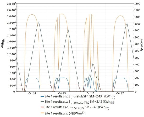 Where the term refers to the design point. Thus, the simplified equation for modeling the quasi-dynamic charging and discharging behavior of the energy stored in the TES—to give continuity to the operation of the plant and overcome the effect of transients in the DNI, which reduces the SF’s useful thermal energy—is presented in the following expression: