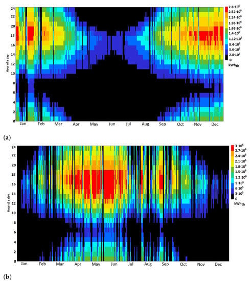 Moreover, as the TMY data come on an hourly basis, the thermal energy delivered by each loop () in kWh can be determined with the product between and the elapsed time (1 h). The energy delivered by each loop in can be computed by Equation (11), which considers that when the DNI is null or when the DNI is not high enough to compensate for thermal losses during the day and, consequently, , it considers these values null. That is: