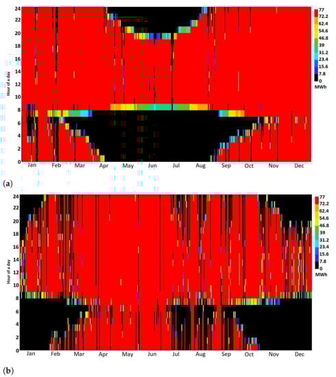 Design considerations of both plants were defined according to international practical/operational experience of PTSTPPs, such as Andasol 1-3, Solar Energy Generating Systems (SEGS) Plants, and Noor-1 [,,], among others, and based on the knowledge of the authors of the present paper. As an example, the main design parameters adopted for the simulations of the plants are shown in Table 6. Eurotrough ET-100, Schott PTR-70, Therminol VP-1, and Solar Salt were selected as the PTC, receiver tube, HTF, and molten salt, respectively []. Furthermore, an HTF temperature difference of 100 C between the inlet and outlet of each loop of the SF was considered, with HTF temperatures of 293 C and 393 C at the inlet and outlet, respectively, for both locations. In the same way, 38%, 98%, 97%, and 95% peak power cycle performance, TES–HTF heat exchanger efficiency, HTF–water heat exchanger efficiency, and soiling factor, respectively, were considered. Moreover, it is important to point out that the number of loops that compose each SF is that required on the design day to produce the thermal energy necessary for the PTSTPP to operate at full load during the whole day (24 h).