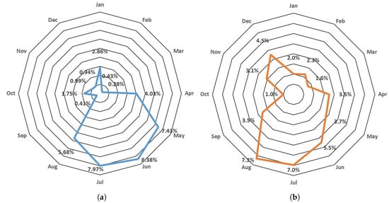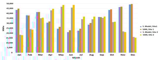 Locations with an annual DNI value of a least 2000 kWh/m per year have the potential to be techno-economically suitable for the implementation of CSP plants []. Both sites comply with this consignment, as they have 4041 kWh/m and 2687 kWh/m per year for site 1 and site 2, respectively.