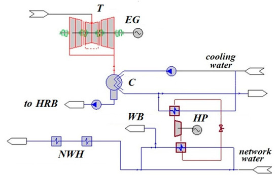A significant obstacle to the large-scale use of heat pump technologies is the lack of a clear understanding of the energy segment where they could be applied [23]. Traditionally, heat pumps are considered to be a decentralized energy production technology, while centralized heat supply and combined generation of electric and thermal energy are the basis of power industry several countries [24]. On the other hand, heat power plants produce a significant amount of low-potential heat, primarily in the cooling systems of steam turbine (ST) condensers; that can be used in HPUs [25]. The use of HP in the technological scheme of TPP will allow to use the considerable amount of waste heat, to increase the supply of thermal energy to the external consumer and also to reduce the loss of high-potential heat, decrease fuel and water consumption and, as a result, increase the marginal income of the TPP [26].