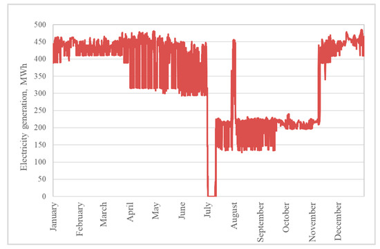 Thus, during the day, the electrical capacity of TPP varies within the control range to maintain the required amount of electricity production in the power system. Figure 2 shows the hourly production of electricity CCGT-450 (double-block) in the annual section. Figure 3 shows an example of a daily change in the electrical load of the CCGT-450 within the adjustment range.