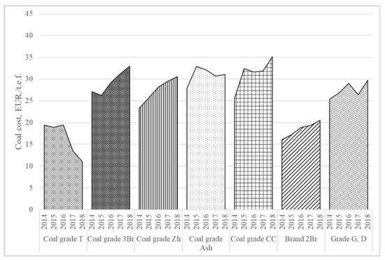 - The average price of coal equivalent varies from 20 to 65 EUR/t.e.f.