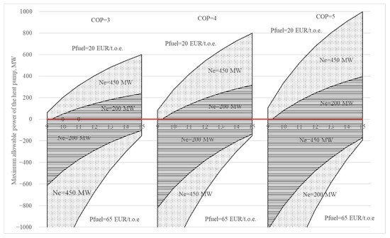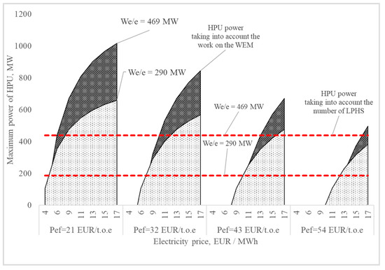 For HPU operating as part of the thermal scheme of TPP, the maximum power consumption per hour of HP () can be defined by the following Equation (3):