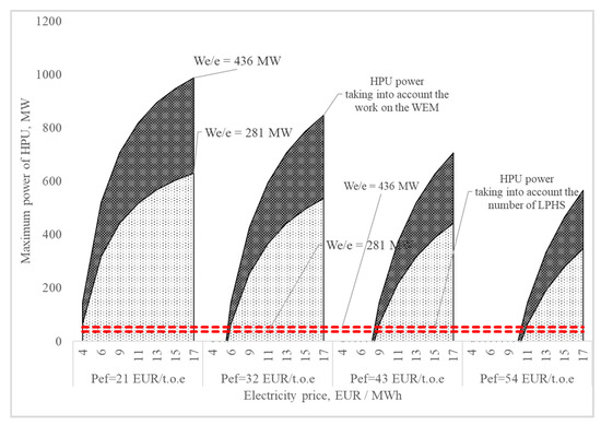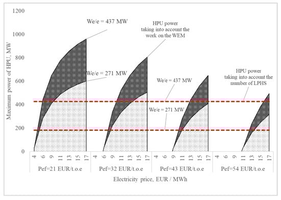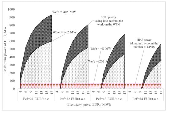 Taking into account the Equations (1)–(3), the allowable hourly consumption of electricity on HPU, which determines its maximum power, will have the form (4):
