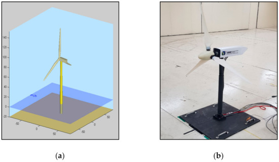 Because the wind turbine scaled model was a VSVP wind turbine with a tip speed ratio of approximately 7–8, the operating region was similar to that of a large wind turbine. Therefore, the wind turbine scaled model was suitable for verifying the controller of a large wind turbine. There are cases of controller verification using a wind turbine scaled model in other studies [24]. The specifications of the two wind turbines are given in Table 1, and the images are shown in Figure 1.