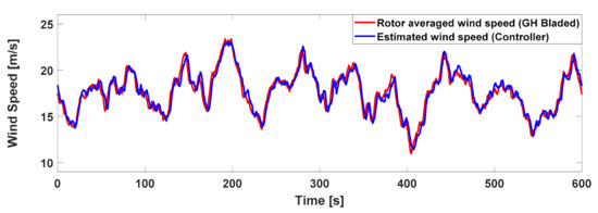 To verify the performance of the wind speed estimator, Figure 3 shows the rotor-averaged wind speed obtained from DNVGL-bladed (4.6, DNV-GL, Oslo, and Norway). As a result of estimating the wind speed with 20% turbulence intensity of the average wind speed of 18 m/s, it was almost identical.
