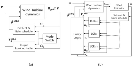 The fuzzy inference techniques are widely used in many areas as well as wind power and have an advantage to compensate and further improve the control performance by linking them with machine learning techniques such as neural network and genetic algorithm [18,19,20,21,22]. Recently, a study was conducted on parallel distributed controllers using the Takagi–Sugeno (T-S) fuzzy model [16]. In that study, the LQG controller with fuzzy logic was used to consider the nonlinearity of wind turbines, and the control performance was improved. However, in that study, the target wind turbine was not a commonly used VSVP wind turbine but a variable-speed fixed-pitch (VSFP) wind turbine. In addition, the performance verification of the controller was performed only through steady-state simulation.