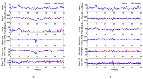 The LQRF control was also applied to a wind turbine scaled model, and similar dynamic simulations were performed to compare the performances of LQRF and conventional PI controllers. This is because the simulation results with the wind turbine scaled model can be experimentally verified in a wind tunnel unlike the case of NREL 5MW wind turbine. The simulations were performed at two different mean wind speeds, 6 m/s and 8 m/s at a turbulence intensity of 10%. Unlike large wind turbines, the dynamic simulations were performed for 60 s, since it is sufficient to identify the dynamic behavior of the wind turbine scaled model. The results are shown in Figure 7. Figure 7a, b are the simulation results at the mean wind speeds of 6 m/s and 8 m/s, respectively. Both compares the performances with the LQRF and the conventional PI controls.