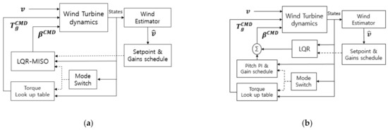 Block diagram of multi-input single-output (MISO) based LQR pitch controllers. (a) LQR-MISO control system; (b) LQR-PI control system.