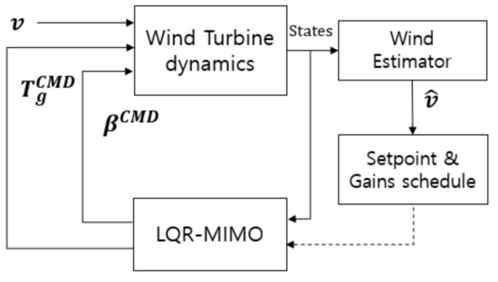 Figure 11 shows the MIMO-based LQR control algorithm [25]. This controller is not limited to the blade pitch control but it uses both blade pitch angle and the generator torque commands simultaneously as outputs for power control. The torque control of LQR-MIMO control can be additionally controlled to reduce the deviation of the power, rotor speed and tower vibration compared to the conventional torque control. The LQR-MIMO uses multiple wind turbine states as inputs to find out optimal generator torque and the blade pitch angle commands. It doesn’t use a mode switch that is used in the conventional PI based controllers.