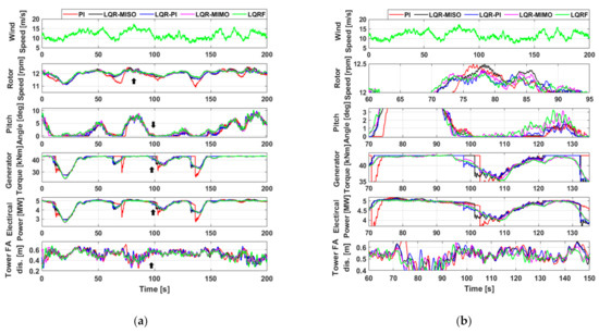 Figure 12 shows the simulation results with the wind speed of 12 m/s. Figure 12a, b are the zoomed-out and zoomed-in views of the same results, respectively. As can be seen in the figures, the results with the five different controllers mostly look similar. However, there exist differences in the deviation. In Figure 12a, sudden drops are shown in the generator torque and the power when the conventional PI control was used. However, for other controllers the drops are reduced by different magnitudes. This kind of sudden drops in the generator torque and the power are often observed with the conventional PI controller due to the switching mechanism of the mode switch [27] in turbulent winds. These sudden drops are shown more clearly in Figure 12b. The conventional PI, LQR-MISO, LQR-PI controllers use similar torque and pitch control loops with a mode switch, and as the result, such sudden drops in the generator torque and the power are shown in all cases. However, the drop gets reduced with the LQR-MISO, and reduced further with the LQR-PI control. This kind of sudden drops are not shown in the LQR-MIMO, and the LQRF control because no mode switch is used in those controllers. In the rotor speed, the conventional PI and the LQR-MISO yielded the highest deviation. The rotor speed deviation was reduced for the LQR-PI, LQR-MIMO, and the LQRF control.