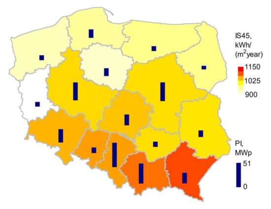 Poland has average values of insolation in Europe, which in individual provinces are in the range from 900 to 1150 kWh/m2/year (according to the Typical Meteorological Year) [,]. The differences in insolation occurring in individual provinces lead to a thesis that the share of projects located in southern voivodships should be greater than those located in northern Polish provinces, because the greater value of insolation makes the installation more energy-productive and economically effective. In this context, the question arises as to whether this issue should not determine the intensity of support. The economic efficiency of the installation is also influenced by its size, which is related to the effects of scale. Therefore, the power of the installation may also determine the intensity of support in addition to insolation (availability of solar energy). It is possible to estimate what the support intensity should be in individual voivodships in order to use the funds available under the “My Electricity” program most effectively. For this purpose, a mathematical model has been built, which has been used to optimize the use of subsidies financed under the “My Electricity” program. Figure 1 shows the annual insolation for each province and the total installed capacity in the “My Electricity” program until 1 August 2020 (according to the approved ranking lists).