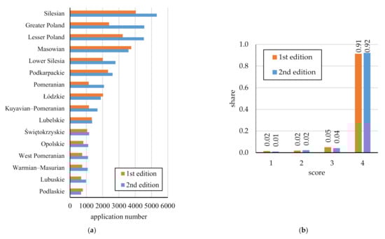 (a) Number of applications accepted in two editions of the “My Electricity” program (applications accepted until 1 August 2020) []; (b) Share of PV installations with a certain number of points among installations supported by both editions of the “My Electricity” program (applications accepted until 1 August 2020).