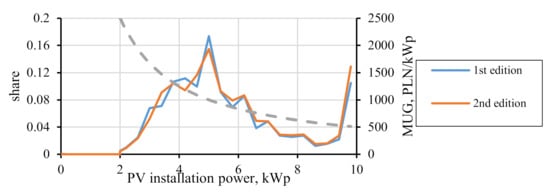 In both editions, the average PV installation power of 5.69 kWp was achieved (5.57 kWp in the first edition and 5.79 kWp in the second edition). The standard deviation for the data from the first edition has a value of 2.01 kWp, and that for the second edition has a value of 2.07 kWp. The curves presenting the occurrence of specific installations sizes for both editions and also the maximum unit grant amount are presented in Figure 3.