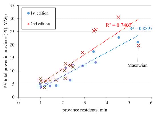 The value of the R2 coefficient (Figure 4) for second edition is much higher, without taking into account the Masowian province (point 5.42 million; 19.77 MWp in Figure 4), which is 0.91. In case of the first edition, eliminating from the calculation of the R2 coefficient the above-mentioned province practically does not change the result. Due to the high correlation shown in Figure 4, the power index expressed in Wp per resident (PPI) [] was calculated according to the formula below. The results are listed in Table 4.