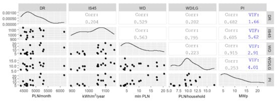 The collinearity of explanatory variables was examined. The results are shown in Figure 5. The collinearity of the variables was not found. The values of the Variance Inflation Factor (VIF) indicators for all analyzed variables are below 6. Due to the transformations of the variables used to build the model, structural multicollinearity was observed, but it does not affect the quality of forecasting the value of the explained variable, which is crucial for this work. Structural multicollinearity is important for the interpretation of model parameters; however, this issue has no significance for the research problem being solved.