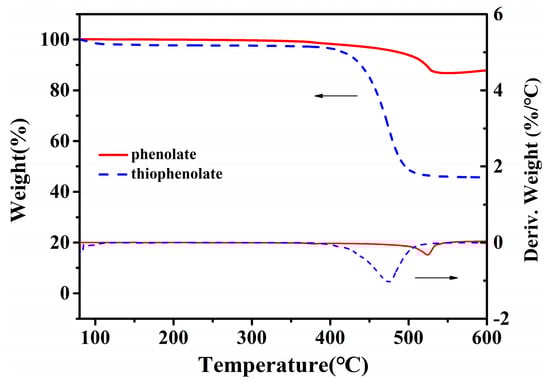 Figure 1 shows their thermogravimetric analyses. It can be clearly seen that the temperature at the maximum mass loss of thiophenolate is more than 50 °C lower than that of phenolate. Thus, DBTs might be more easily formed from thiophenolate than DBFs from phenolate.