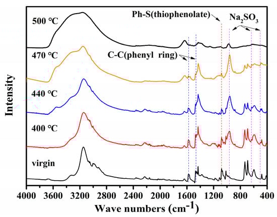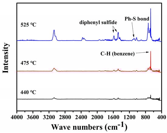Figure 5 shows the FTIR spectra of the residues from the thermal degradation of thiophenolate at different temperatures. Notably, the intensity of the absorption of Ph−S at 1089 cm