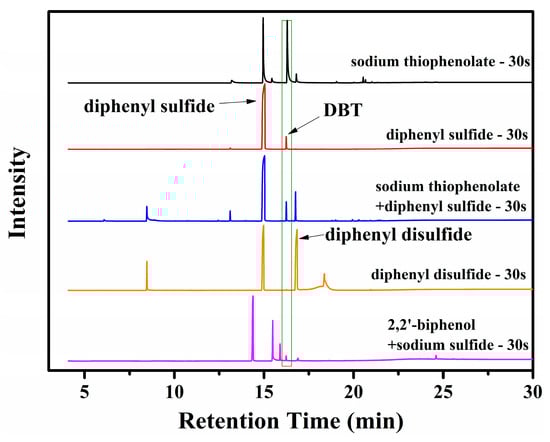 Figure S2). This result indicates the formation of DBT from 2,2′-bithiophenolate or similar sulfur substituted biaryl compounds which are generated from 2,2′-biphenol and sulfide. In addition, this transformation is backed by the presence of hydroxyl-DBT, which appears at 16.9 min and is identified by its MS spectrum (to see in