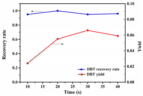 Figure 4 illustrates the recovery rates of standard DBT samples and yields of DBT from thermally treated samples. It can be seen that all the standard DBT samples were essentially recovered, indicating that DBT barely decomposes or escapes from the glass tubes. This lends confidence to the measurement of yields of DBT from the thermal degradation of thiophenolate. Noticeably, the yield of DBT increases first then stays about 6–7% during 20–40 s, suggesting that the thermal degradation of thiophenolate is complete within 20 s. Considering that the mass loss of thiophenolate is about 55% as shown in