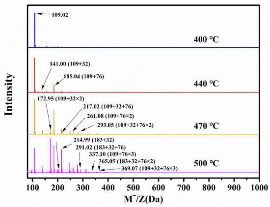 n = 0, 1, 2) emerge at 440 °C and grow with the temperature. A species matching MW = 183 + 32 m + 76 k (