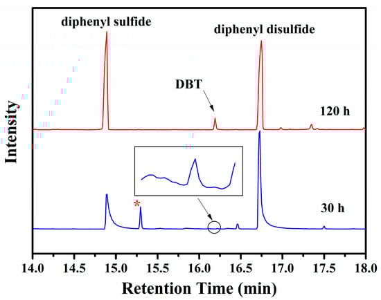 Figure 8. It can be seen that a new peak albeit with a weak absorption emerges at 16.2 min after 30 h, suggesting the presence of trace DBT. The slow generation of DBT from the thermolysis of thiophenolate at the relatively low temperature should come without surprise since the formation of DBTs in nature takes many years. However, the peak of DBT grows significantly with time and becomes one of major species in the residue obtained after 120 h. This species is further confirmed to be DBT by its MS spectrum with a molecular weight of 184.